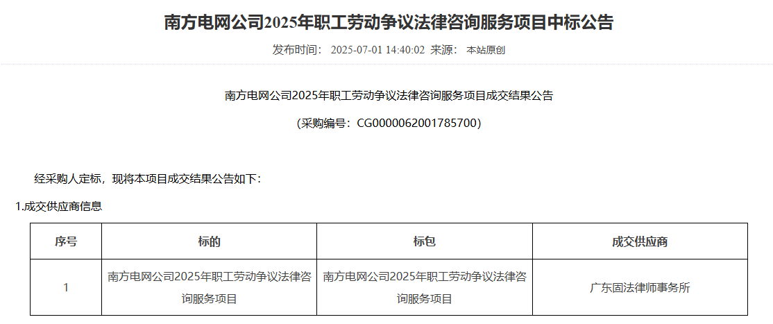2025年7月1日南方电网公告,该集团公司的2025年职工劳动争议法律咨询服务项目中标单位为广东固法律师事务所。